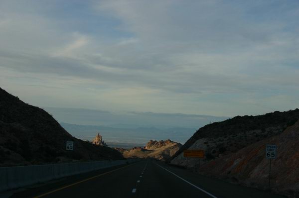And speaking of scared! I'm nearly 50 feet long and heavey, and we're driving on damp roads w/ snow behind us, and the temp is sitting on 34°. Sounds to me like a recipe for disaster. So, being of sound mind and body, slowed down. But oh no, not the local Albuquerque'ians. To them, it was a chance for adventure! So I'm winding through the 'canyon' east of town, going downhill at maybe a 6 or 7% grade, semi's are using the run-away ramps, it's snowing and I'm sweating, women and babies are screaming, and the locals? The locals are doing 80. Ok, maybe that's an exageration... but I'm doing 50 and I feel like a marble in a pinball game w/ bumpers and corners and the ocassional paddle screaming by. Some of that traffic was going EASILY 20 to 30 MPH faster than me and most of the trucks on the road.